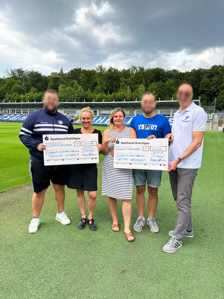 Wir überlegten uns, die Spendenübergabe bei einem Heimspiel zu machen und bezogen die Kinder der Gruppe mit ein. Diese hatten einen in Eigenregie gebastelten Scheck mitgebracht. Die Spendenübergabe erfolgte am 10. März 2019 vor der Südkurve mit anschließendem Besuch des Spiels, für das uns die TSG Freikarten für die Kinder und deren Betreuer bereit stellte.